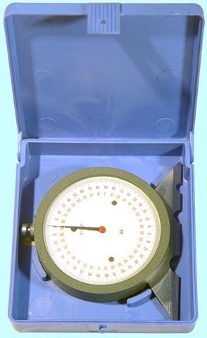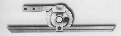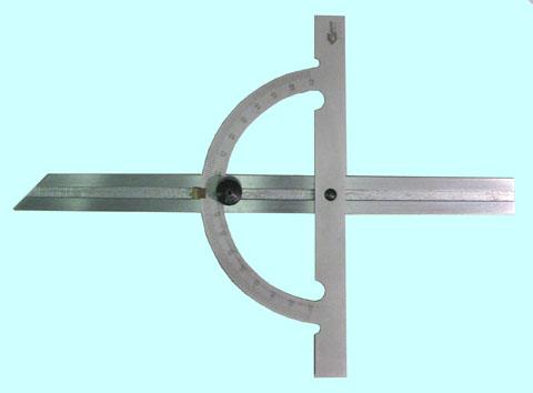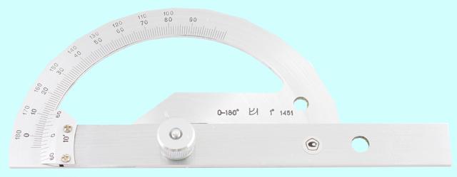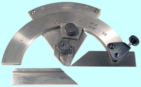 Угломер-транспортир с нониусом представляет собой пластину полукруглую со шкалой, разбитой на градусы, которая шарнирно соединяется «ласточкиным хвостом» латунными ползунками с направляющей. Приставляя угломер к детали, необходимо совместить базовую сторону детали с одним из краев направляющей линейки. Поворотом полукруглой пластины, перемещая ее по направляющей, ее совмещают с сопряженной линией детали. Угол определяется по шкале угольника.