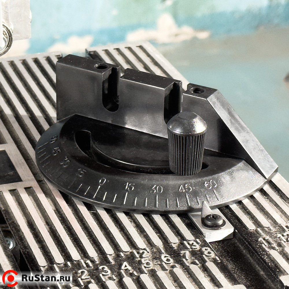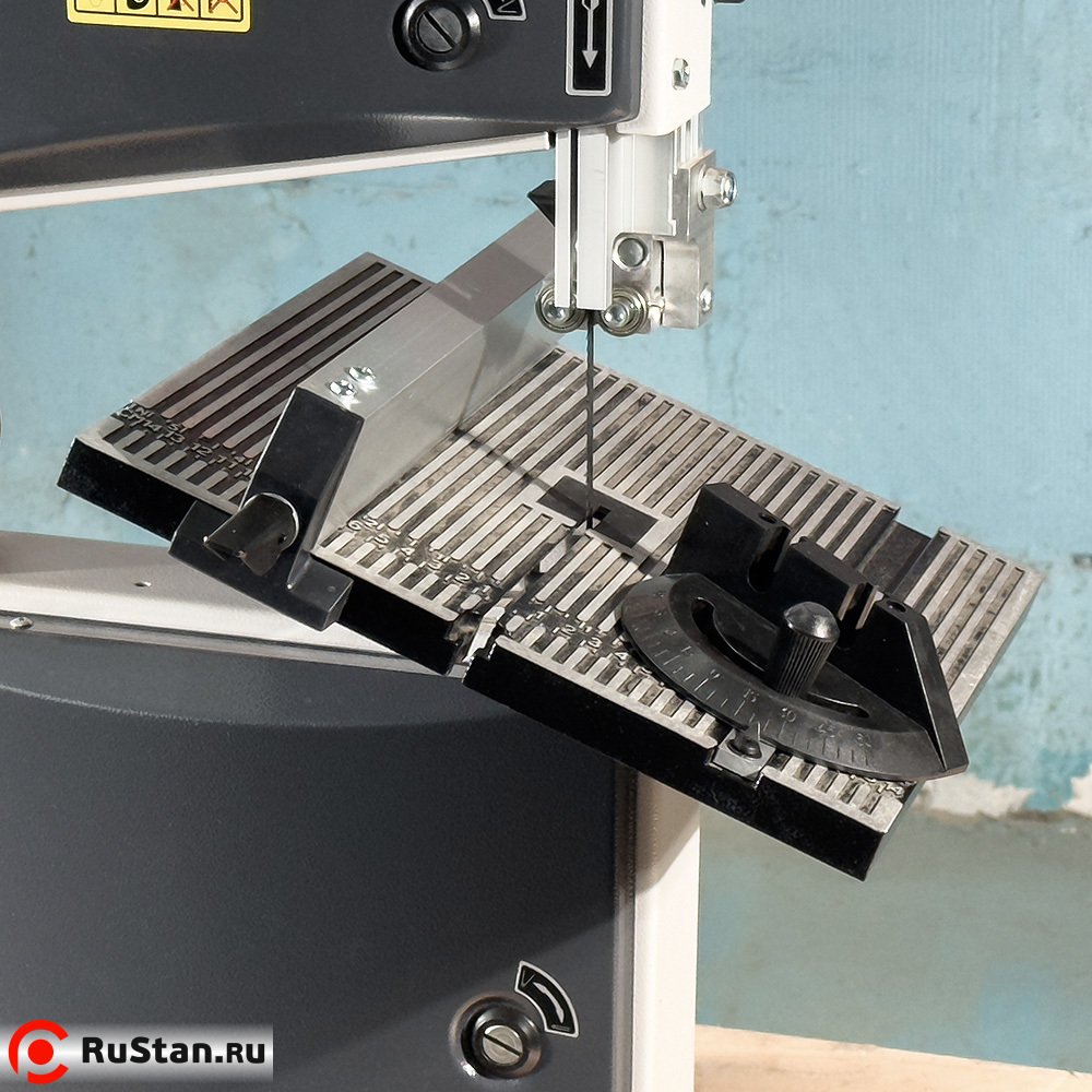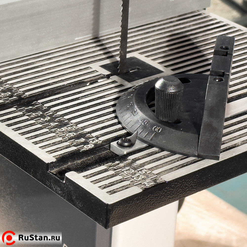Для точной обработки большого количества одинаковых изделий в комплекте ленточной пилы имеются упор с линейкой и транспортир, с помощью которых устанавливается длина обрабатываемого изделия и угол среза на нём
