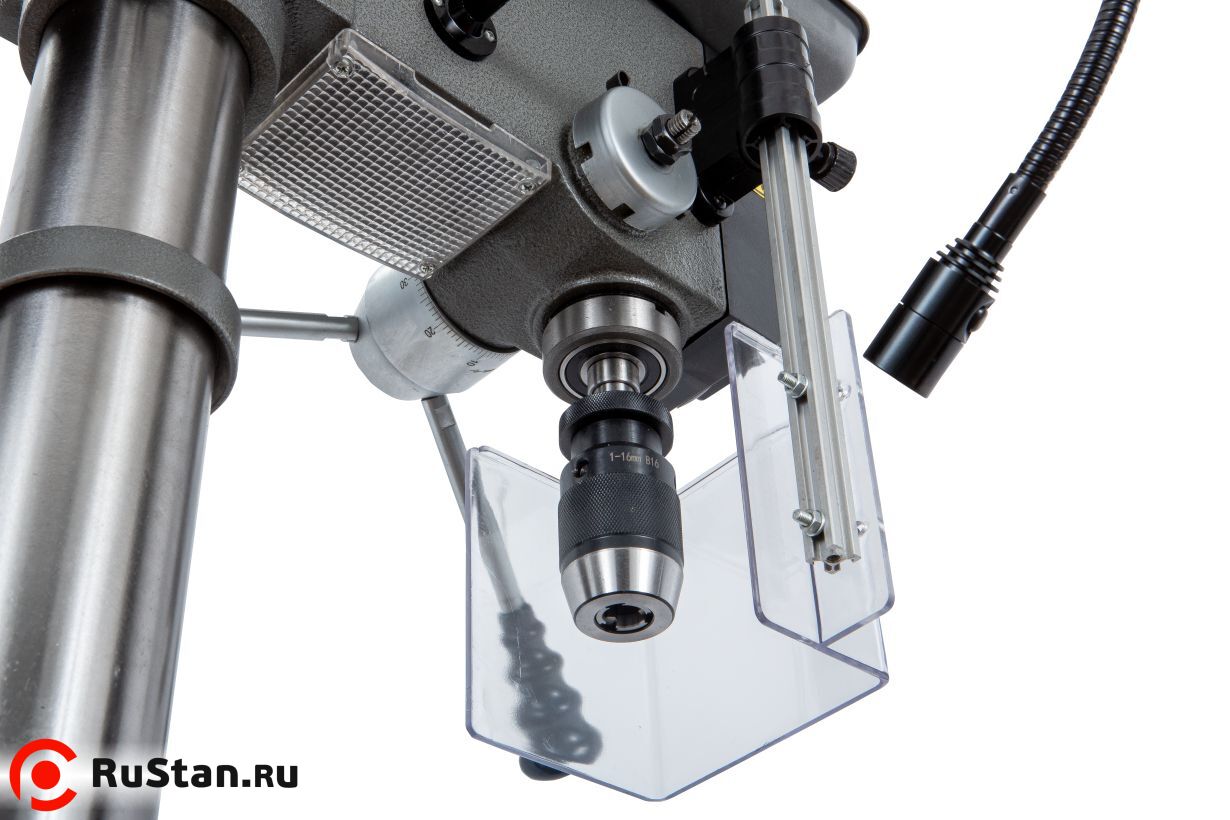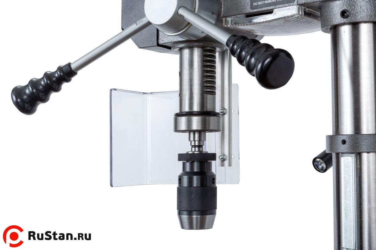 Ход пиноли шпинделя составляет 80 мм. Для контроля глубины сверления предусмотрена шкала на лимбе с миллиметровой разметкой, а также стопорный зажимной винт для ограничения хода пиноли.